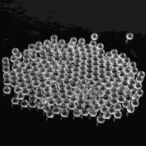 道路反射ガラスビーズは、ガラス砂(廃ガラス)を高温で溶かしてできたガラス球の一種です。顕微鏡下では球形で、無色透明で、屈折率は1.5〜1.64です。